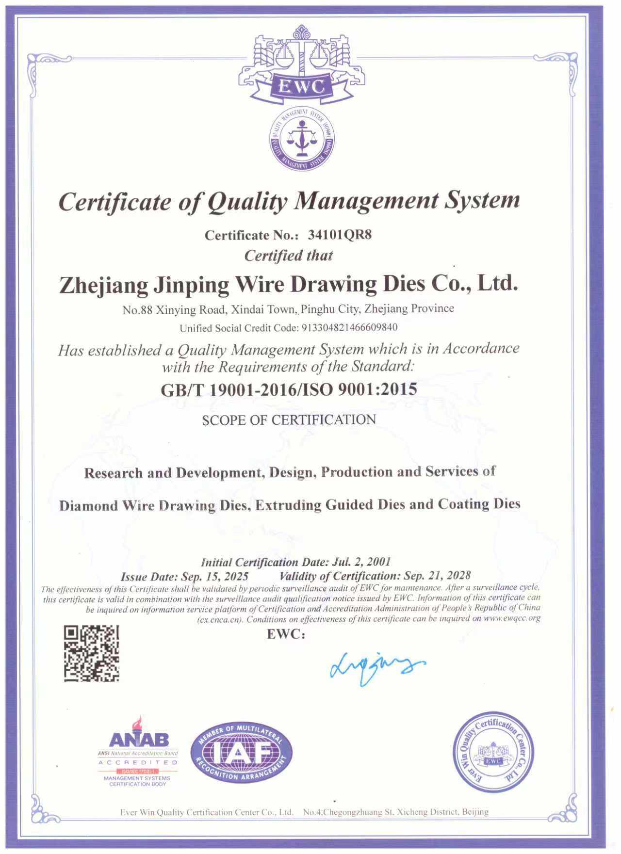 Эти продукты производятся в соответствии с системой управления качеством ISO 9001: 2000, а также нашей высококвалифицированной командой, состоящей из профессиональных технических инженеров, опытных специалистов по контролю качества и испытанию продукции. Для производства точных волочильных матриц для тонкой проволоки мы приобрели ряд первоклассных инструментов, например, лазерную систему Spectra-Physics DISQ-Mark из Соединенных Штатов Америки, алмазную сверлильную станку из Японии в процессе лазерной сверления. Также через несколько месяцев мы получим систему контроля качества Conoptica, импортированную из Норвегии. И на данный момент наша компания является крупнейшим производителем волочильных матриц в Китае.